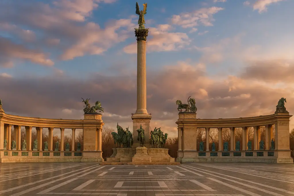 La Plaza de los Héroes, construida en 1896 para conmemorar el milenio de Hungría, es uno de los espacios más emblemáticos de Budapest. Este majestuoso conjunto monumental, coronado por la columna del Arcángel Gabriel, está flanqueado por dos imponentes columnatas que albergan las estatuas de los líderes más importantes de la historia húngara. Es el punto de partida perfecto para nuestro recorrido, conectando con el Parque de la Ciudad y la histórica Avenida Andrássy. Para conseguir las mejores fotografías, recomendamos visitarla a primera hora de la mañana, cuando la luz es más favorable y hay menos turistas.