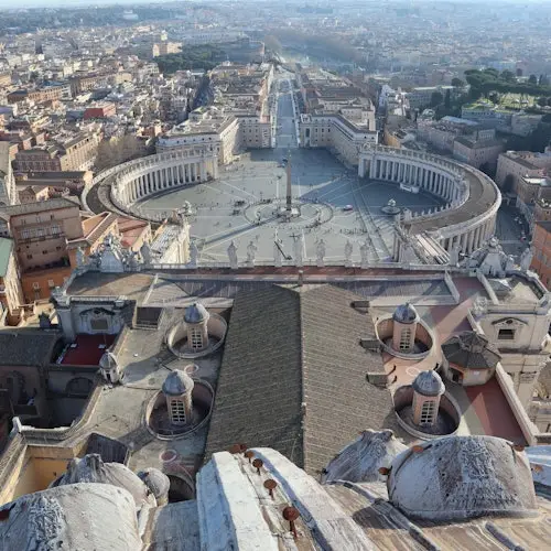 La Basílica de San Pedro es el centro de la Iglesia Católica y una obra maestra del Renacimiento italiano. Construida sobre la tumba del apóstol San Pedro, la actual basílica fue diseñada por grandes artistas como Bramante, Miguel Ángel y Bernini. Con su inmensa cúpula y su interior ricamente decorado, que incluye la Pietà de Miguel Ángel, es la iglesia más grande del mundo y puede albergar a 60,000 personas. La Plaza de San Pedro, diseñada por Bernini, forma un magnífico preludio a la basílica con su columnata elíptica.