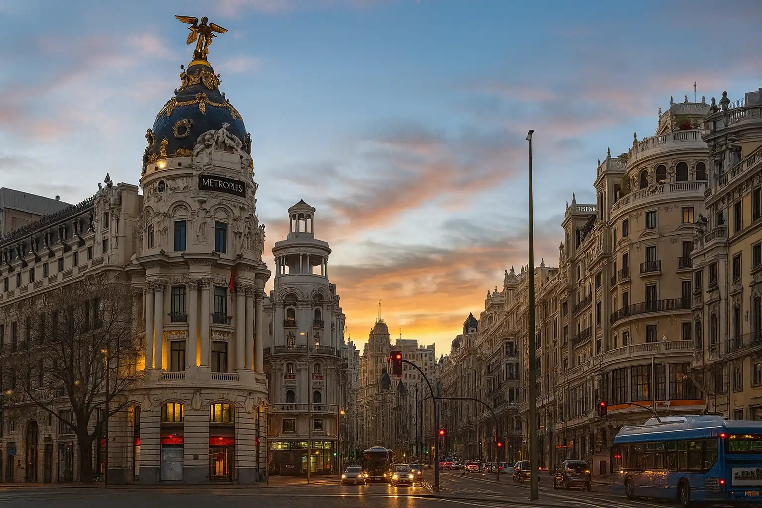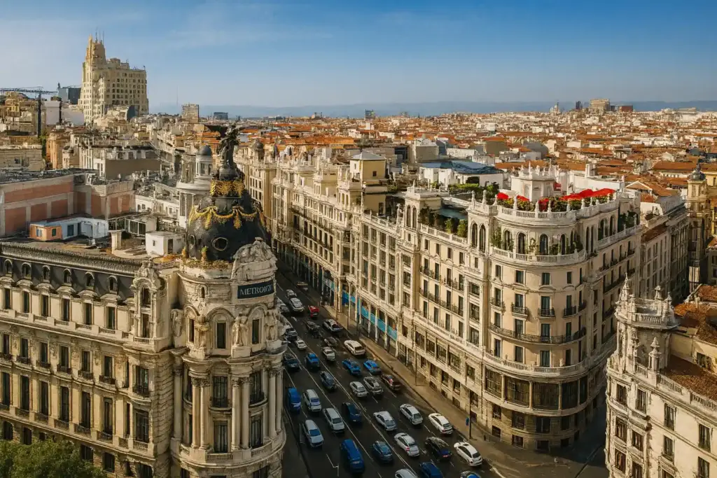 Dejamos atrás la Puerta del Sol para adentrarnos en la Gran Vía, conocida como el «Broadway madrileño». Esta avenida, que se extiende por poco más de un kilómetro, es una de las arterias principales del Centro de Madrid y un verdadero espectáculo arquitectónico.