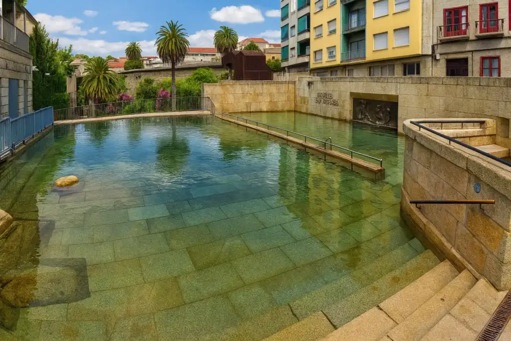 As Burgas: espacio histórico al aire libre. La piscina municipal adyacente está cerrada por reformas; el baño termal urbano se realiza en las zonas del Miño (Outariz, Burga de Canedo, A Chavasqueira).
