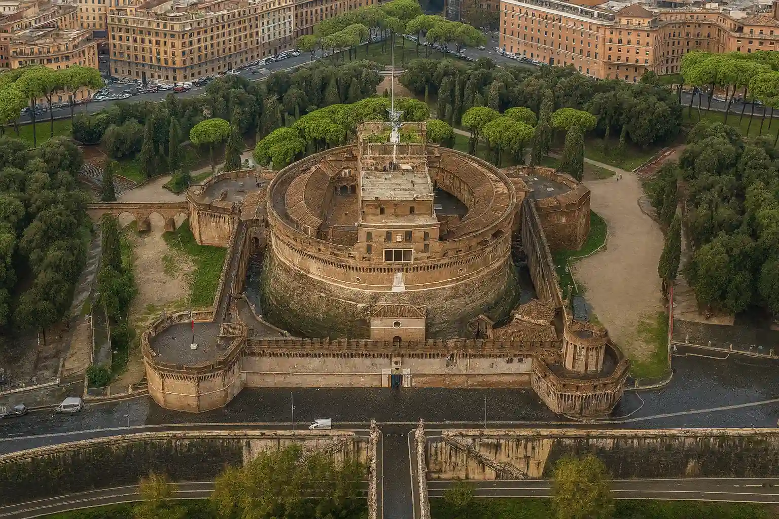 El Castillo de Sant’Angelo (también llamado el Mausoleo de Adriano) se encuentra en el lateral derecho del río Tíber, muy próximo a la Plaza de San Pedro y el Vaticano. El edificio data del 139 d.C. en tiempos del emperador Adriano que inicialmente pretendió que fuera un mausoleo para su familia. Sin embargo en el 403 pasa a convertirse en un edificio militar, integrándose en la Muralla Aureliana.